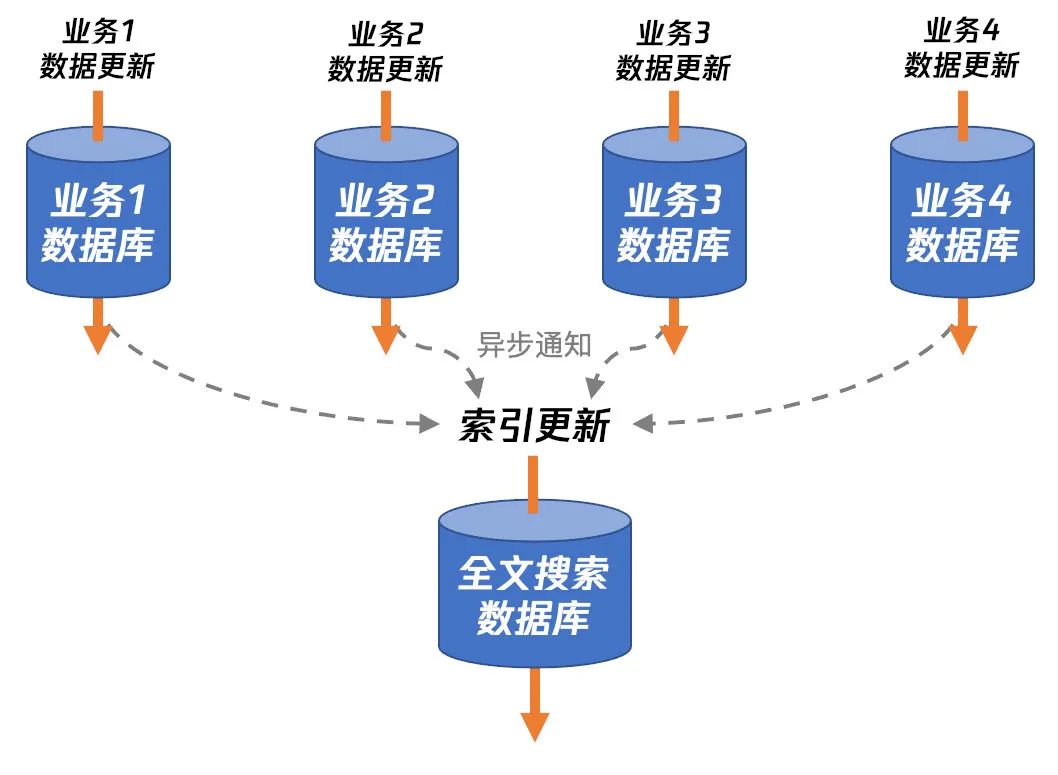 这样做既可以避免索引更新拖慢业务数据更新的速度,也能避免索引数据更新出错甚至索引数据损坏对业务造成影响,让全文搜索功能模块能够充分独立。