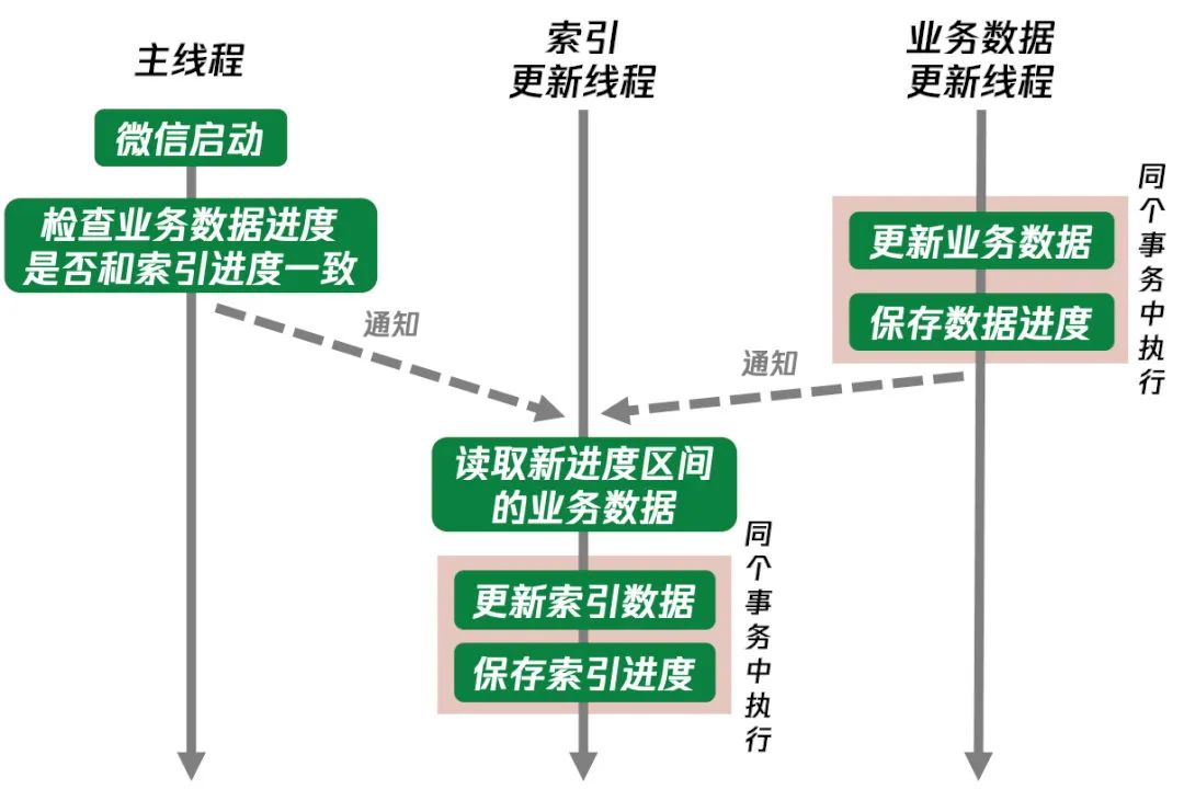 无论业务数据是否保存成功、更新通知是否到达全文搜索模块、索引数据是否保存成功,这套索引更新逻辑都能保证保存成功的业务数据都能成功建到索引。这其中的一个关键点是数据和进度要在同个事务中一起更新,而且要保存在同个数据库中,这样才能保证数据和进度的更新的原子性(WCDB 创建的数据库因为使用WAL模式而无法保证不同数据库的事务的原子性)。还有一个操作图中没有画出,具体是微信启动时如果检查到业务进度小于索引进度,这种一般意味着业务数据损坏后被重置了,这种情况下要删掉索引并重置索引进度。