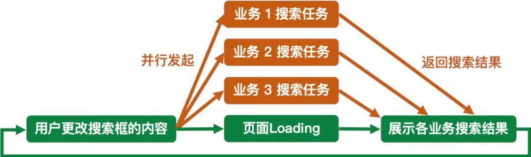 用户变更搜索框的内容之后,会并行发起所有业务的搜索任务,各个搜索任务执行完之后才再将搜索结果返回到主线程给页面展示。这个逻辑会随着用户变更搜索内容而继续重复。