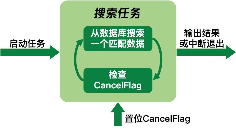 搜索任务支持中断的实现方式是给每个搜索任务设置一个CancelFlag,在搜索逻辑执行时每搜到一个结果就判断一下CancelFlag是否置位,如果置位了就立即退出任务。外部逻辑可以通过置位CancelFlag来中断搜索任务。逻辑流程如下图所示: