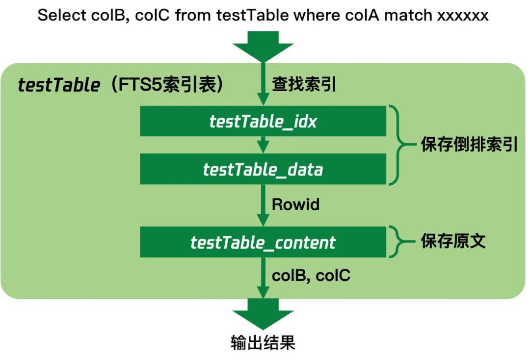 搜索时读取内容的量也是决定搜索耗时的一个关键因素。FTS 索引表实际是有多个 SQLite 普通表组成的,这其中一些表格存储实际的倒排索引内容,还有一个表格存储用户保存到 FTS 索引表的全部原文。当搜索时读取Rowid以外的内容时,就需要用Rowid到保存原文的表的读取内容,索引表输出结果的内部执行过程如下:
