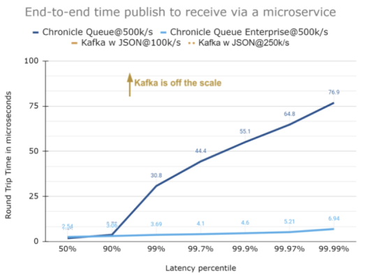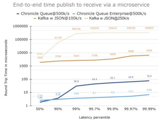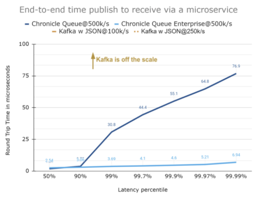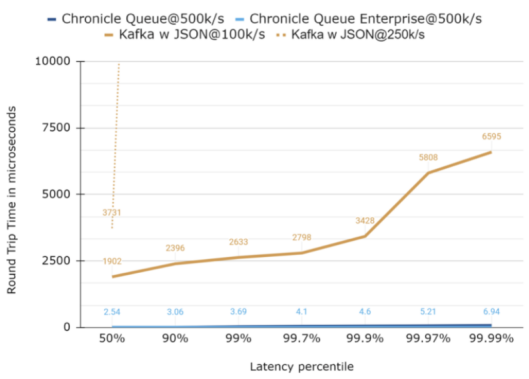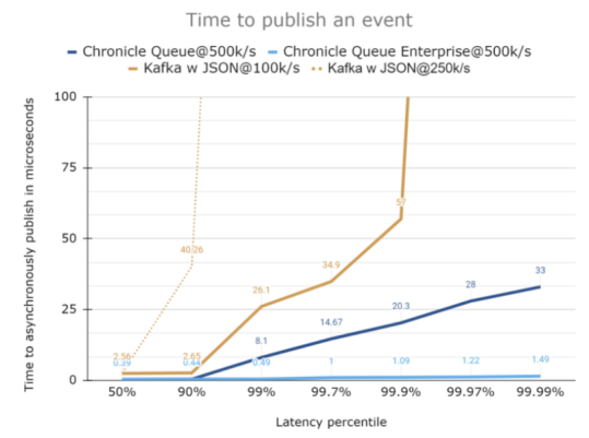 虽然Kafka是日志聚合的不错选择,但由于其相对较高的端到端延迟,对于许多涉及到微服务的用例而言,其延迟可能会比较明显。开源式的Chronicle Queue在超过99.99%的时间内,都能够实现低于100微秒的一致性延迟。而Kafka即使在吞吐量只有Chronicle的五分之一的情况下,也会有7毫秒的异常值。
