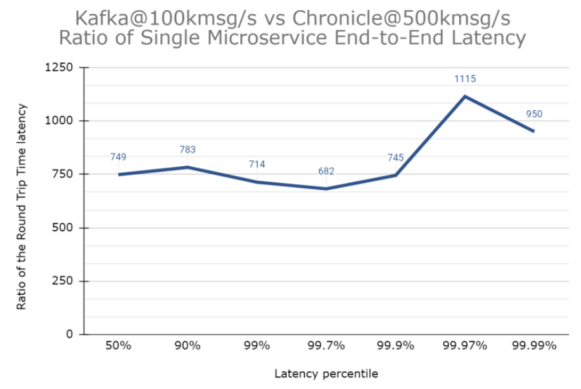 另一种可视化Kafka延迟的方法是绘制Kafka和Chronicle之间的延迟比率。下图是Kafka在100k msg/s(最佳结果之一)和Chronicle Queue企业版在500k msg/s(即负载为Kafka的5倍)之间的延迟比率图。在该基准测试中,即使其吞吐量只是Chronicle Queue的五分之一,Kafka仍然始终慢了至少680倍。