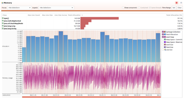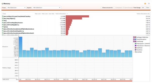 我们让Chronicle Queue以500k msg/s的消息写入速度,并通过使用G1收集器和默认的GC参数,产生40 MB的峰值堆大小,并持续运行了5分钟(总共3亿条消息)的基准测试。其结果如下图所示。当然,Chronicle Queue并没有使用到标准的Java序列化功能。