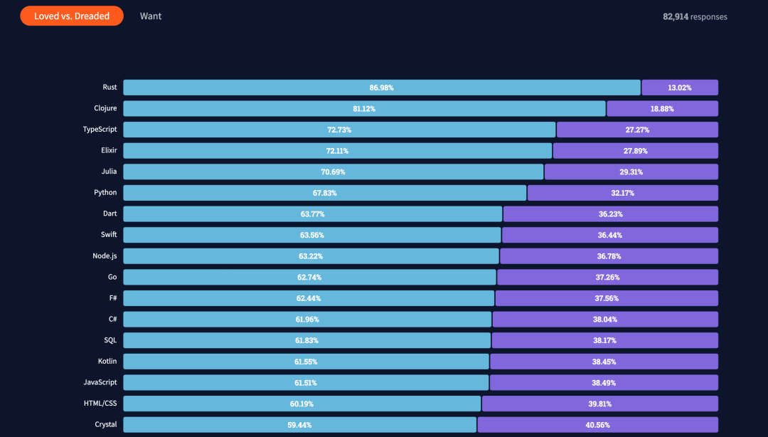 不久前 Stackoverflow 网站做了一项有八万多开发人员参与的调查问卷,在“大家最想学习的编程语言”选项中,Rust高居第一。