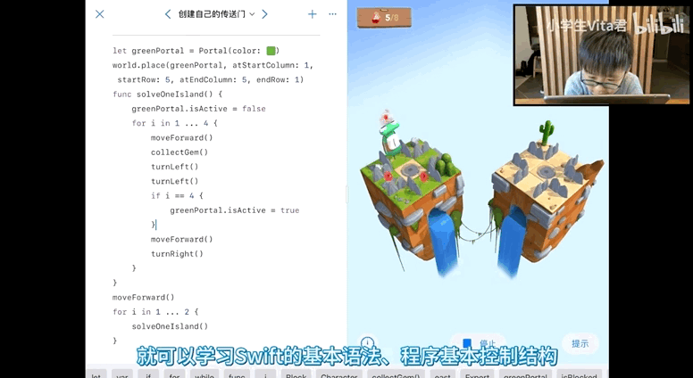 视频所讲的主要软件与上面的探索者Ongo一样,都是苹果开发的Swift Playgrounds,一款通过代码操控卡通小人在3D环境中通关的产品: