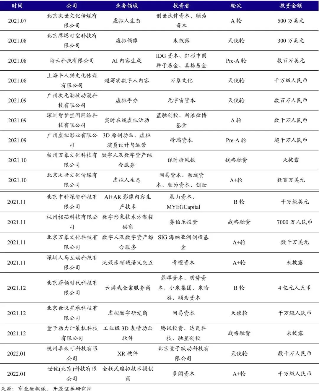 2021.07-2022.01 虚拟数字人融资项目汇总,来源@商业数据派、开源证券研究所