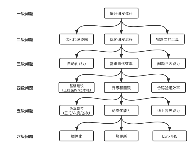 我们判断当前的研发体验不能满足业务日渐延伸的需要,这是一个矛盾,既是当下的挑战,也是当下的一级问题。要处理好这个矛盾,我们得拆解它,于是就有了二级问题:我们的代码逻辑是否已经足够优化?研发流程是否已经足够便捷?文档工具是否已经足够完备?二级问题也是矛盾,解决好二级问题就是我们处理一级矛盾的手段。这样层层递进下去,我们就能把握住当前我们要重点优化和建设的一些基础能力:插件化、热更新、跨端能力。