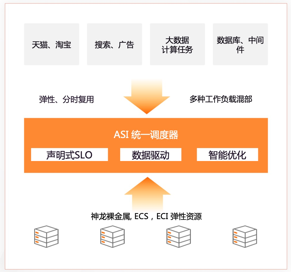 今天,统一调度已实现阿里巴巴电商、搜推广、MaxCompute 大数据的调度全面统一,实现了 pod 调度和 task 高性能调度的统一,实现了完整的资源视图统一和调度协同,实现了多种复杂业务形态的混部和利用率提升,全面支撑了全球数十个数据中心、数百万容器、数千万核的大规模资源调度。