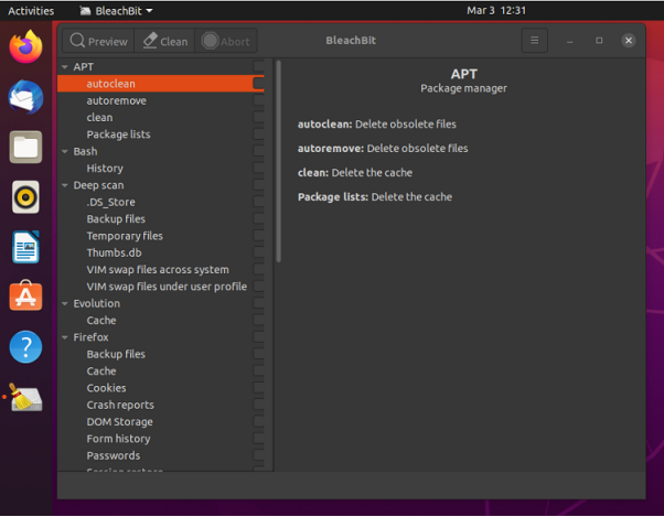 • 它可以清除包括:缩略图缓存、浏览器缓存、以及APT缓存等不同的缓存文件。