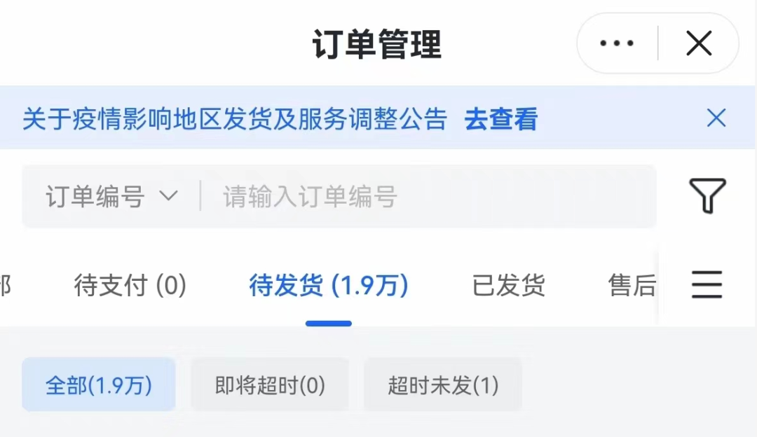 全面封控期间,位于上海的某抖音代运营机构负责人在朋友圈无奈感叹,“这个疫情导致我们公司的销售额直接下降10%”,配图是后台订单管理页面,显示有1.9万笔订单待发货。