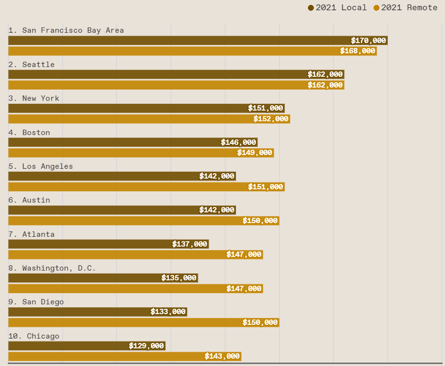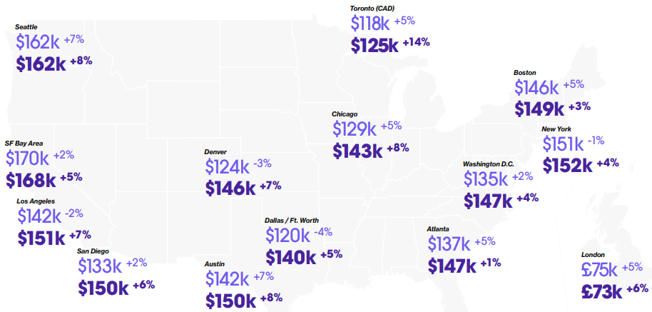 在美国,薪资排名最靠前的地区是:旧金山湾区、西雅图、纽约,其次是波士顿、洛杉矶、奥斯汀、亚特兰大、华盛顿特区、圣地亚哥、芝加哥等地。