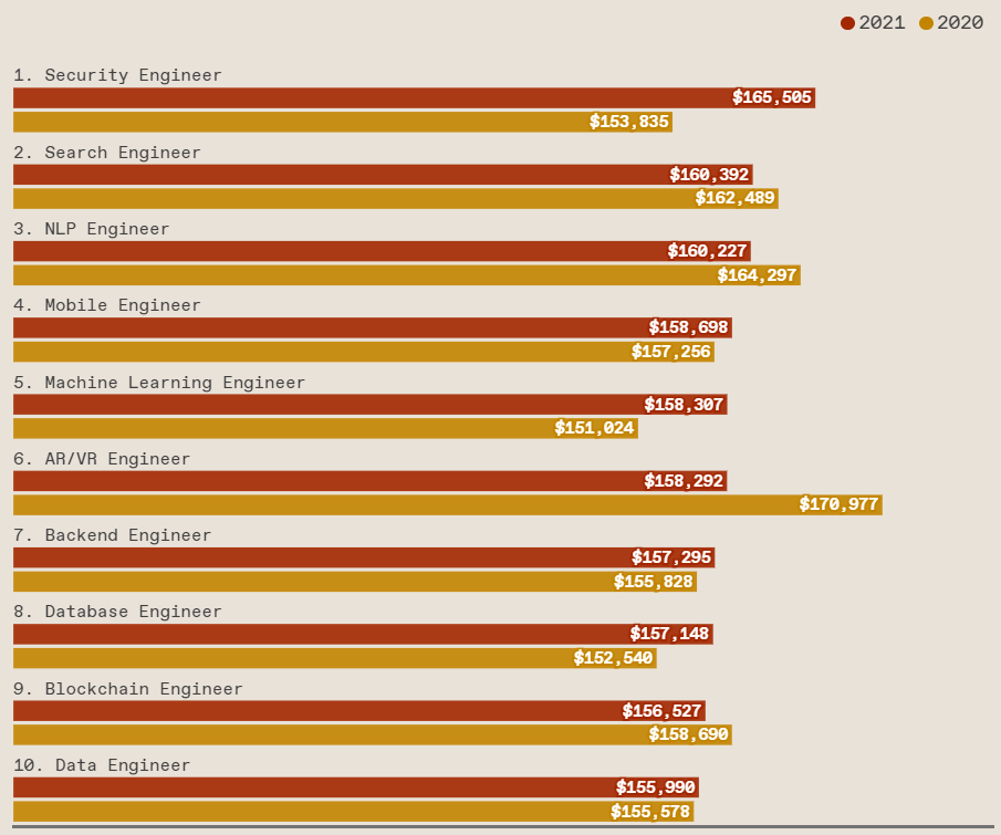 而2021年火爆的元宇宙好像并没有给增强现实/虚拟现实工程师带来一丝丝「福利」,他们不仅在排名上掉到了第6位,年薪也从17万美元降至15.8万美元。