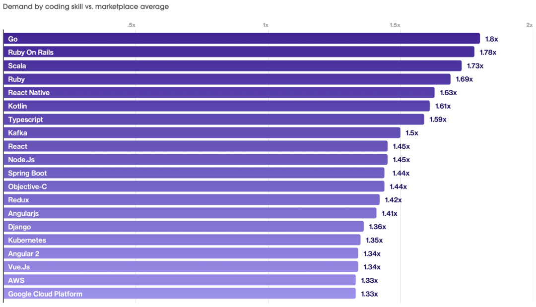 除此之外,受欢迎的前端JavaScript库React的需求量也很高。初创公司、老牌公司和工程团队都越来越多地将React作为重新构建平台的机会。