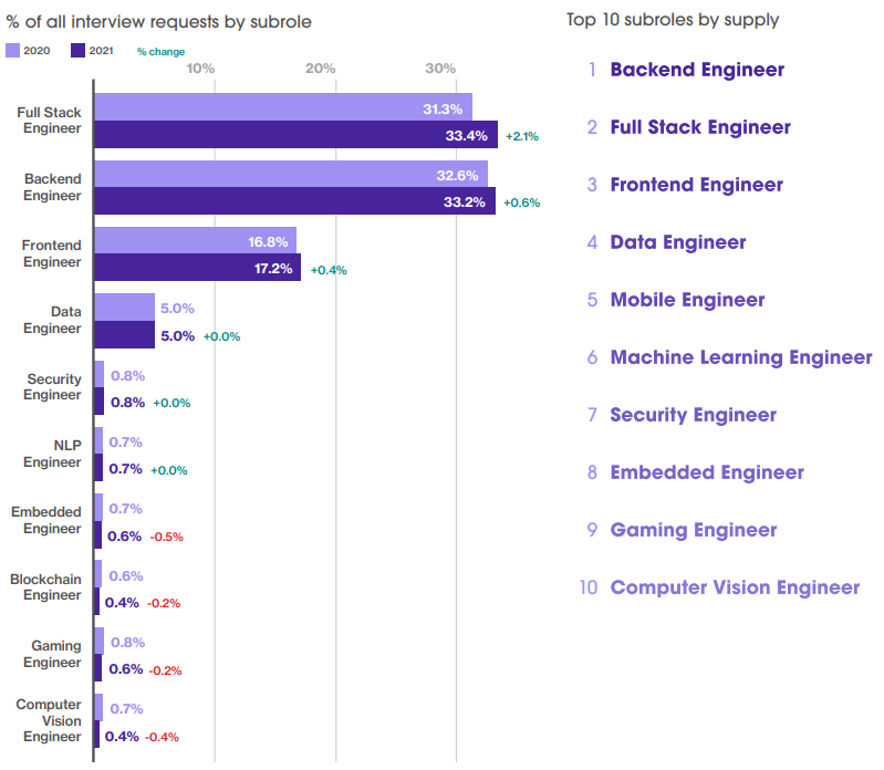 然而,从上图右边的排名可以看出,后端工程师、全栈工程师、前端工程师是目前市场上供给较多的软件工程师类型。