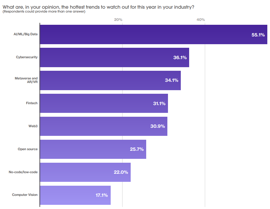 虽然薪资不升反降,但元宇宙以及相应的AR/VR技术依然备受关注,其比例达到了34.1%。