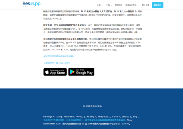 ResApp 公司旗下有三大产品体系,分别应用于急性呼吸疾病诊断、慢性呼吸疾病管理和睡眠健康管理领域。值得一提的是,睡眠健康管理主要是帮助具有睡眠呼吸障碍的人群。ResApp 开发了一种阻塞性睡眠呼吸暂停筛查测试程序,通过床头的智能手机来记录夜间呼吸和打鼾声以识别阻塞性睡眠呼吸暂停 (OSA)。传统方式的睡眠呼吸暂停诊断需要在实验室使用多个传感器,进而生成多导睡眠图 (PSG),而 AI 分析检测的方式几乎「无感知」,将对人体的干扰降为最低。
