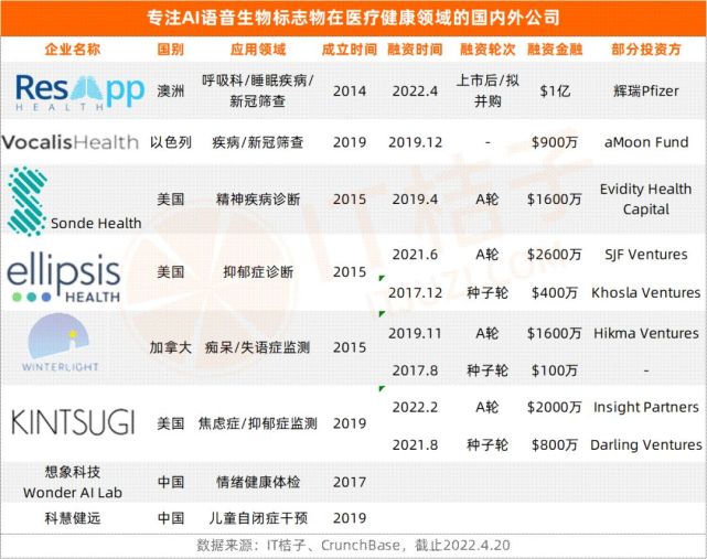 除了上文说到的 ResApp,IT 桔子观察到全球范围内另有其他一些使用声音做诊断的公司获得了融资。比如美国抑郁症诊断语音分析领域的 Ellipsis Health 完成了 2600 万美元 A 轮融资,加拿大 AI 语音诊断技术研发商 Winterlight Labs,以及专注识别焦虑和抑郁等疾病的美国初创公司 Kintsugi 在近半年内分别完成 800 万美元的种子轮融资和 2000 万美元的 A 轮融资。