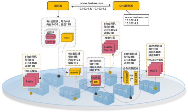 以淘宝作为例子。在网站最初时,应用数量与用户数都较少,可以把Tomcat和数据库部署在同一台服务器上。浏览器往http://www.taobao.com发起请求时,首先经过DNS服务器(域名系统)把域名转换为实际IP地址10.102.4.1,浏览器转而访问该IP对应的Tomcat。