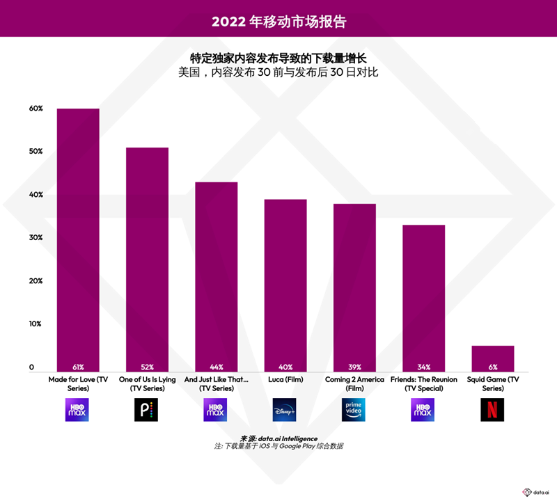 在 data.ai 的《2022 移动市场报告》进一步地证明了这种“内容优先”策略的重要性,该报告显示,自 Netflix 在 2021 年 9 月首播《鱿鱼游戏》起,之后的 30 天里其应用的下载量增加了 6%。其他系列的影响带来了更大的冲击(尽管总收看人数很少)。当 HBO 推出《爱芯》时,HBO Max 应用的安装量增加了 61%。该公司在播出《欲望都市》和《老友记重聚特辑》时也获得了类似的下载量增长。观众对独家内容的需求比以往任何时候都强烈,这成为在线视频应用发行商吸引全球观众至关重要的因素。