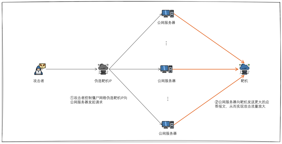 在说明这种新型攻击手法之前,需要先科普一下反射放大攻击。所谓的反射放大攻击是非常常见并且深受攻击者欢迎的 DDoS 攻击手法,其基本原理非常简单:攻击者通过控制僵尸网络伪造靶机 IP 向特定的公网服务器发送请求,公网服务器收到请求后会向靶机发送更大的应答报文,从而实现攻击流量放大。