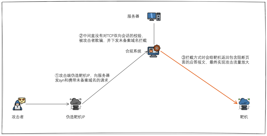 攻击者伪造靶机公网 IP,向存在中间盒(一般是合规系统)的公网 IP 精心伪造单向 TCP 连接并发送一个包含未备案域名的请求;