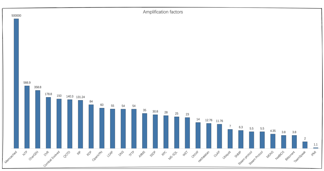 放大系数可以理解为流量的放大倍数,计算方法非常简单,就是 response 总长度/query 总长度。传统的 UDP 反射攻击的放大系数与具体的协议实现相关,所以放大系数是一个相对固定的值:除了 Memcached 反射攻击以外,其他 UDP 反射放大系数不超过 600,而且以 200 以内为主。