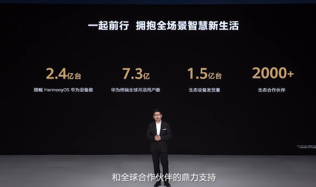 华为终端CEO余承东表示,目前搭载鸿蒙OS的华为设备已超2.4亿台,华为终端全球月活用户数达7.3亿,生态设备发货量1.5亿台,拥有2000+生态合作伙伴。
