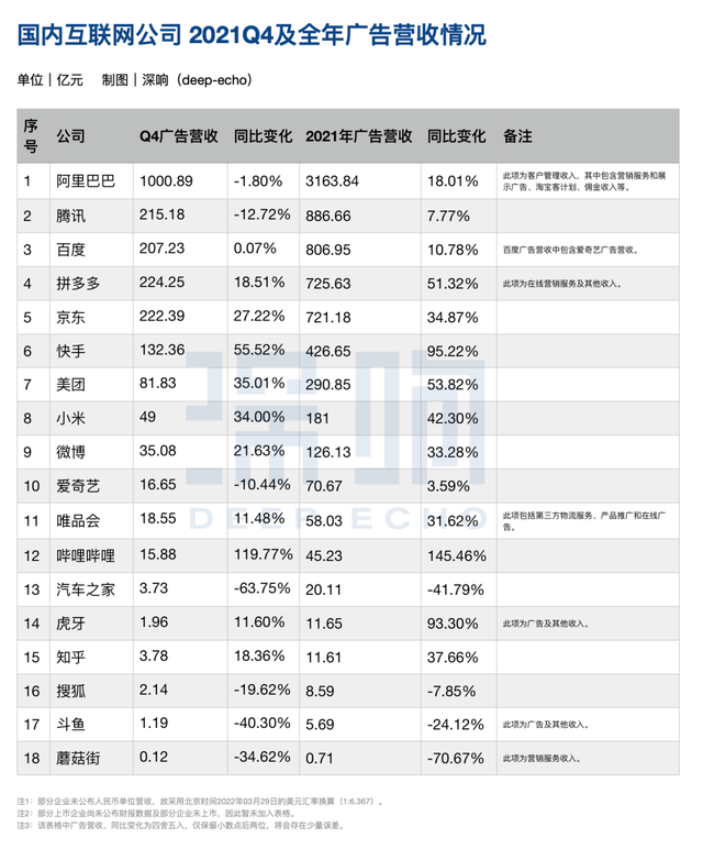 阿里巴巴、腾讯的广告收入在2021年第四季度“史无前例”地出现了负增长。如果连续去看一整年的走势,不少大厂的广告收入增速也都是一路直降。
