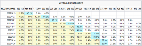其中一个可能最为直接和简单的解释,就是FOMC会议后的表现太过乐观,“涨错了”,毕竟主要资产基本上都完全回吐了周三下午2点半之后美联储主席鲍威尔表示并没有积极考虑75bp加息后的表现(not something the committee is actively considering)(《5月FOMC:加快紧缩但打消更快担忧》)。这一点从期货市场所计入的加息预期中同样可以得到体现,昨天FOMC会议结束后,这一预期一度明显回落,如6月加息75bp甚至9月加息50bp的预期大幅降低,但是最新的数据显示这一概率又都有所回升,使得年底预期再度回到300bp左右。