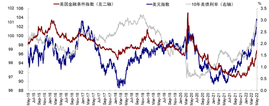 因此,如果上文中分析的情形能够相对顺利的逐渐兑现的话,我们仍有可能看到部分压力先缓解,进而给债券和市场以一定喘息和腾挪空间,否则市场可能仍会面临波动和压力。具体落到资产定价的两个核心变量上,主要观察美元和美债利率能否出现一个甚至两个趋缓或回落的情形,这也就对应着我们上文中提到的紧缩、通胀和增长“不可能三角”至少有两者甚至三者都出现一定缓和。相反,二者同步上涨对于美国和非美资产而言都不是好事,历史上并不多见,本质上意味着对内和对外的金融条件都在收紧,因此也会带来资产普遍上的压力。在美债利率和美元同时大涨背景下,很难找到合适的资产配置,连黄金也失去了避险功能,区别只在于跌幅多寡。
