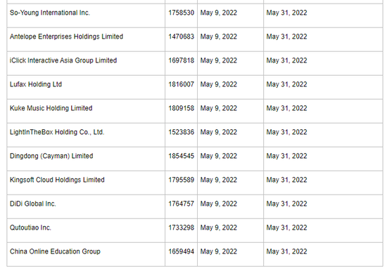 具体名单为:新氧、Antelope Enterprise、爱点击、陆金所控股、库客音乐、兰亭集势、叮咚买菜、金山云、滴滴、趣头条和51Talk。
