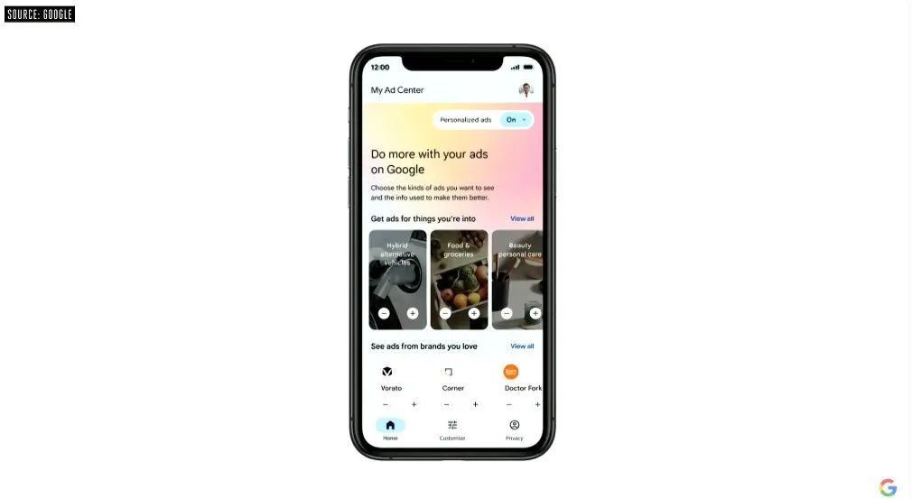 同时, 在谷歌发布的一整套安全和隐私声明中包括了“我的广告中心”界面的计划:用户可以通过从感兴趣的主题中选择一系列内容来定制他们看到的广告类型,或者选择在给定主题上少看广告。