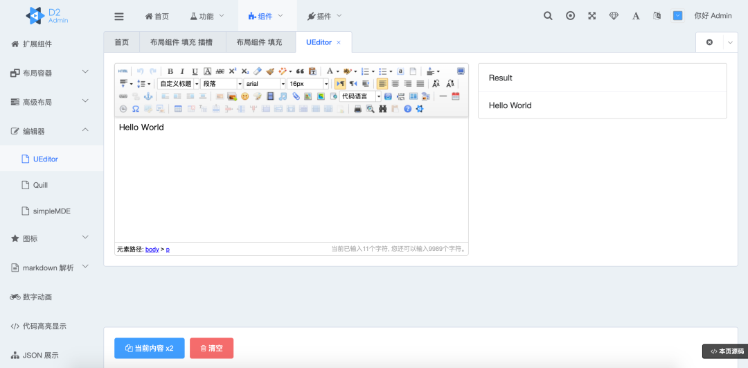 D2Admin 是一个完全 开源免费 的企业中后台产品前端集成方案,使用最新的前端技术栈,小于 60kb 的本地首屏 js 加载,已经做好大部分项目前期准备工作,并且带有大量示例代码,助力管理系统敏捷开发。