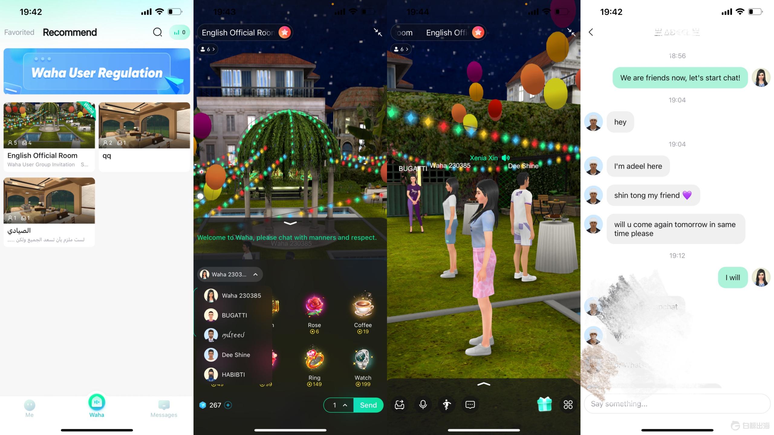 Waha 有旁观和进入房间两种状态,当笔者还在做旁观者时就有用户欢迎笔者的到来,并送出小礼物邀请笔者进入房间。在笔者进入房间后,房间主持人会进行一些简单地规则介绍,主要是让大家保持礼貌、友好交流、玩得开心,房间里的其他用户也会热情地和笔者打招呼,互相介绍姓名和自己的坐标。