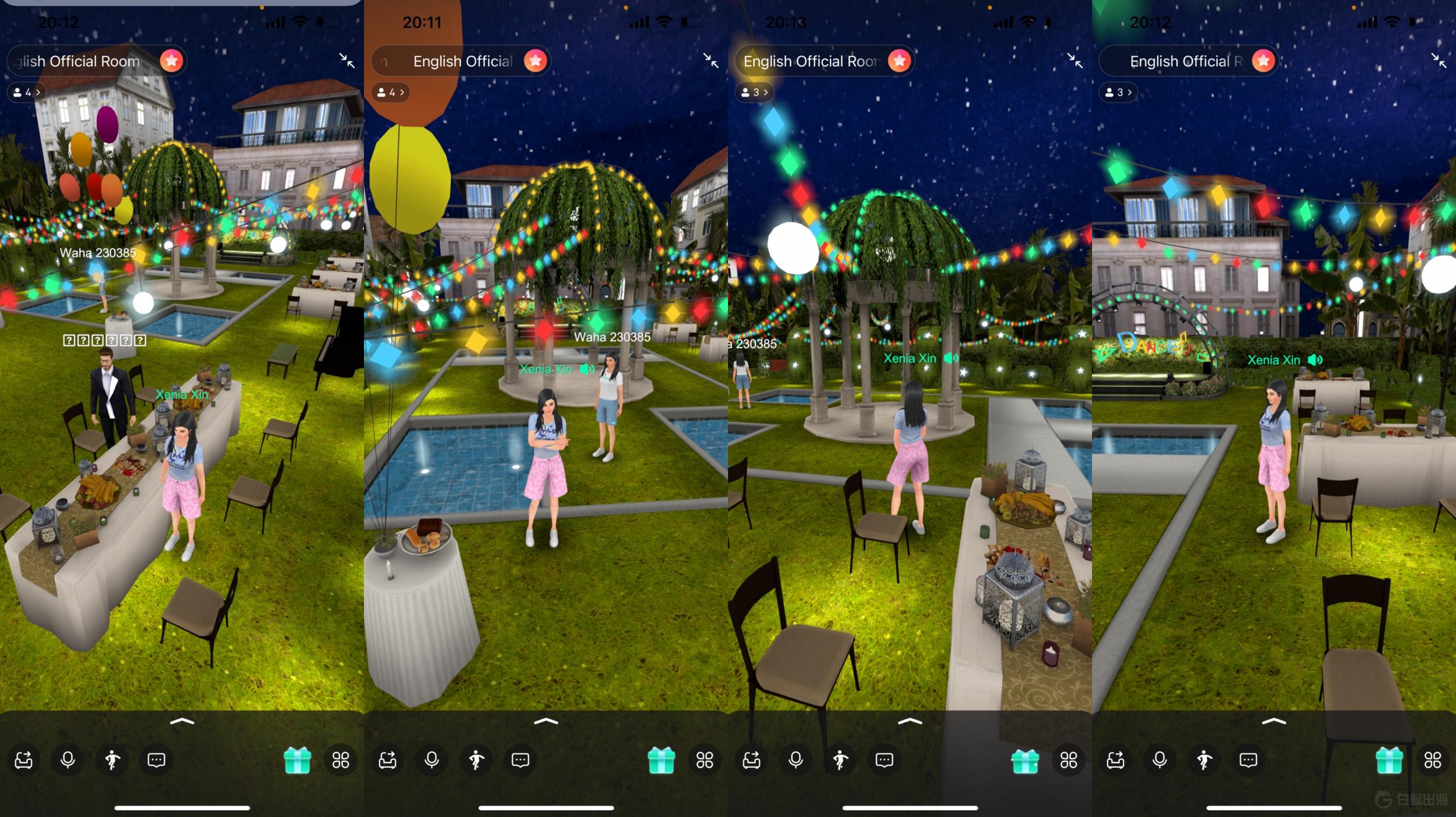 在上次测评中,笔者有提到 Waha 主要有咖啡厅和沙发会客区两个场景,但这次体验时笔者发现了新的“别墅泳池派对”场景。在一栋别墅的后院区,用户可以自由地坐在各个美食区一起“享用各种品类的美食和水果”,相较于拘谨的室内场景,在户外泳池别墅区用户似乎更容易放松。而且相较于之前场景座位相对较为紧密,别墅区则要宽敞很多,完全可以实现公共场景“私密社交”。