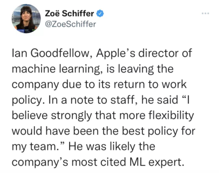根据外国媒体人Zoë Schiffer 的爆料,苹果公司坚持了回办公室工作的政策,并且回办公室的天数越来越多,这才促使Ian Goodfellow选择了离开。据了解,作为人工智能领域的顶级专家,Ian Goodfellow已在苹果公司工作了近四年。