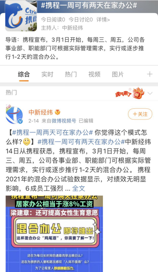 据了解,携程集团宣布3+2的灵活办公模式之前,就曾启动过为期9个月、由客服人员参与的“在家办公”实验。结果显示,在随机实验中,在家办公人员的业绩增加了13%;而那些本来就认为自己适合在家办公的员工,业绩增加22%。同时,员工具有更高的工作满意度,离职率下降了50%。