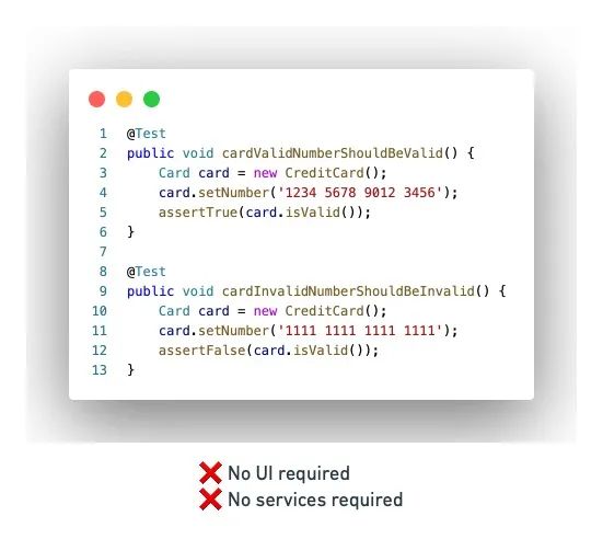 金字塔的底部是单元测试。该单元实际上是一些小段的逻辑代码。它们可以是函数、类、甚至是类中的方法。单元测试仅会检查目标单元的行为,是否符合开发人员的预期。开发人员可以通过编写单元测试,在无需依赖任何其他组件、服务或UI的情况下,直接调用被测试代码,进而评估其输出。