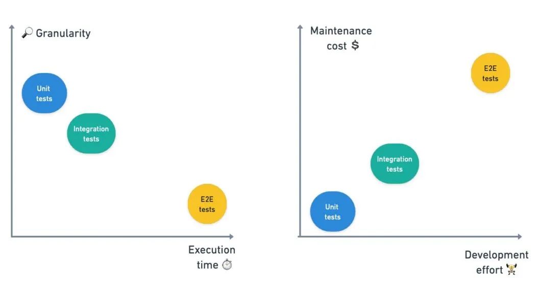 E2E测试则具有编写复杂、难以维护、需要大量资源、并且运行缓慢等特征。不过,由于我们可以通过各种E2E测试工具来覆盖更多的应用程序,因此我们需要执行的测试工作量并不大。