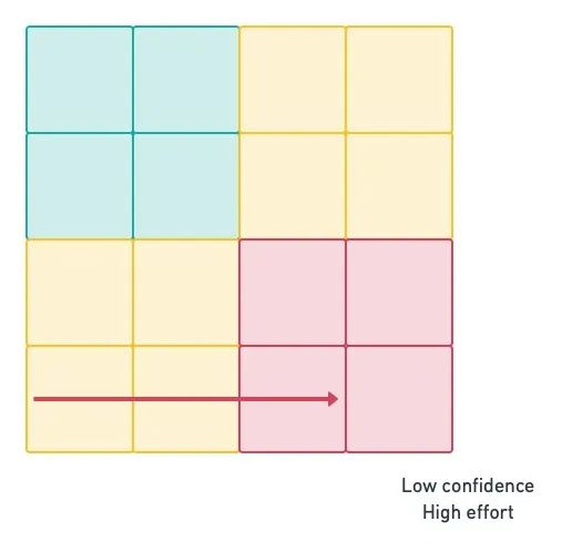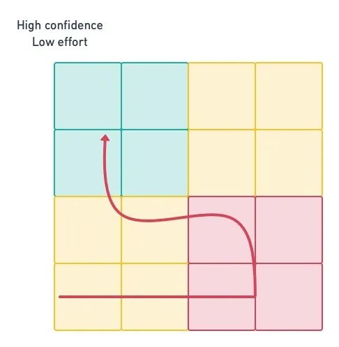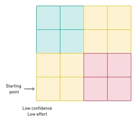 如上图矩阵所示,开发人员精力的投入是从左到右增加的,而可信度是从下到上上升的。显然,最佳位置是在绿色区域。而大多数软件项目都是从低投入和低可信度的黄色区域开始的。