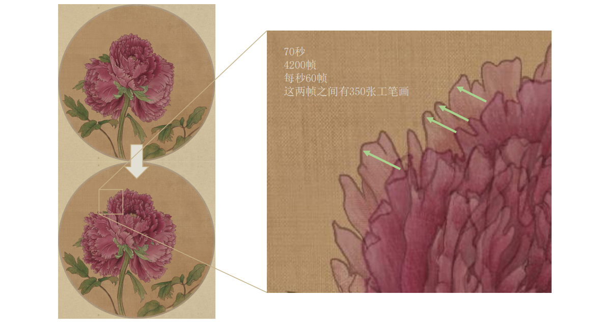 过去只有一种方式可以做这样的事情,就是大量画作的累加,想做到非常顺畅的效果,就需要一帧一帧地创作工笔画,利用巨大的人力投入,去将这种艺术呈现出来。一位普通的美术工作者,大概需要两天时间才能够完成《牡丹图》一帧作品的创作。而这段动画总时长70秒,按照每秒60帧计算,一个人需要十年的时间才能够完成这段动画的制作。