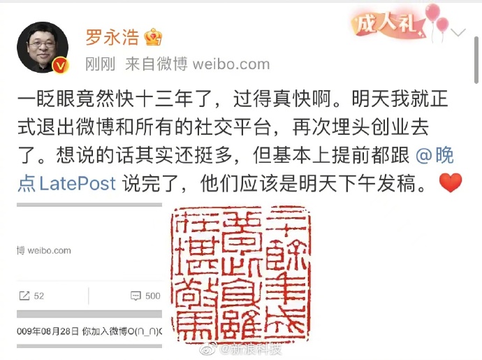 新浪科技讯 6月13日凌晨消息,罗永浩正式宣布“离开”交个朋友管理层,同时退出微博等社交平台,“再次埋头创业去了”。