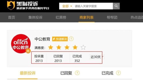 图/在新浪黑猫投诉平台上,中公教育近30天新增投诉量超2000条。