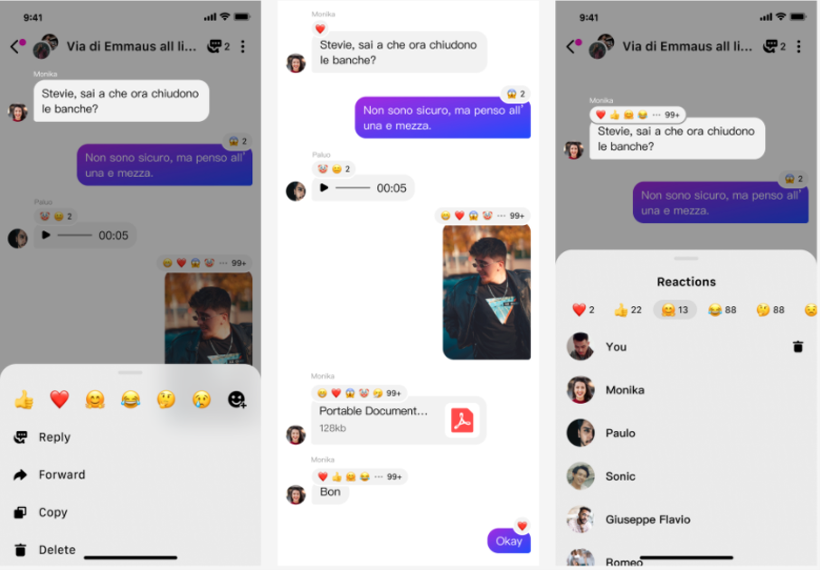 消息表情回复:用户可以在单聊和群聊中对消息添加、删除表情。表情可以直观地表达情绪,使用表情回复增加用户互动,提升用户使用体验。同时在群组中,利用表情回复可以发起投票,根据不同表情的追加数量来确认投票。