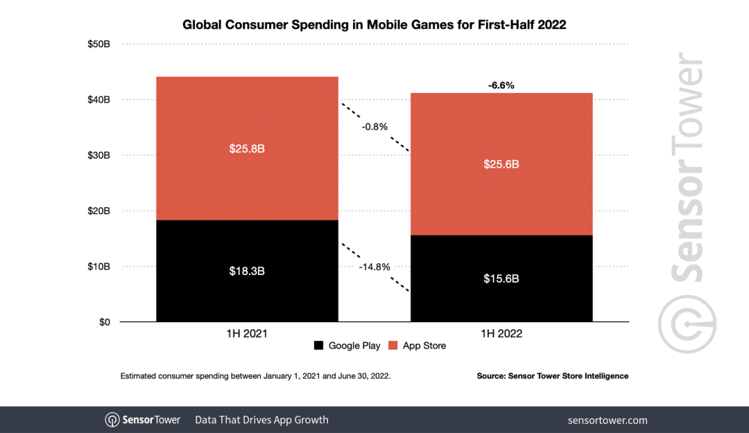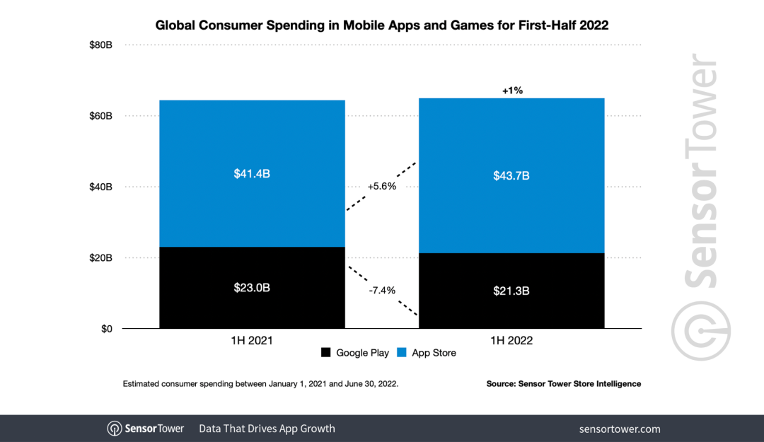 Sensor Tower 商店情报显示,2022 年上半年,App Store 和 Google Play 商店的总收入达到了 644 亿美元,同比增幅仅为大约 1%。