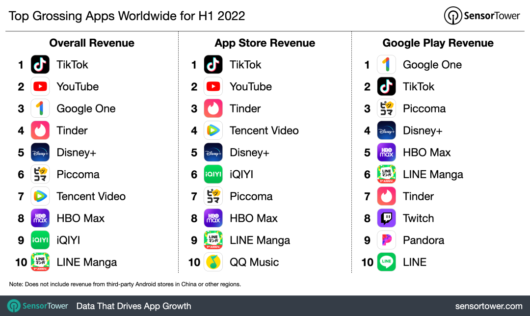 今年上半年,YouTube 是全球营收排名第二的非游戏类应用,营收约为 6.936 亿美元。Goolgle One 排名第三,上半年收入接近 6.14 亿美元,Tinder、迪士尼旗下的在线流媒体平台 Disney+ 在这项统计中分别位列第四和第五。