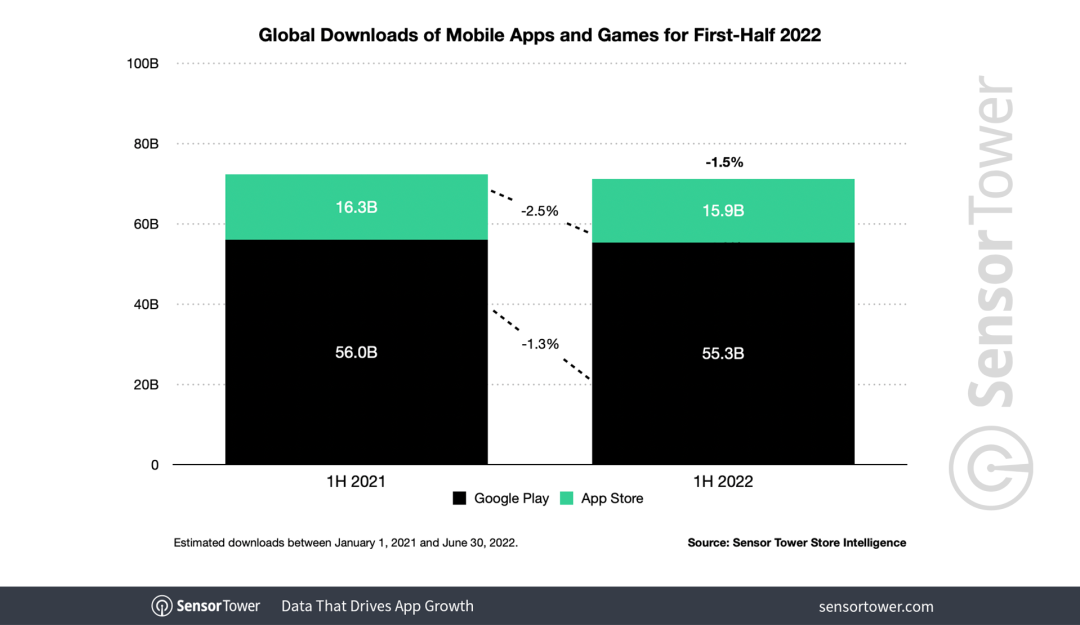 Sensor Tower 提到,在 2022 年上半年,App Store 和 Google Play 商店的移动应用总下载量约为 712 亿次,与去年同期的 723 亿次下载相比下滑了 1.5%。其中,苹果 App Store 上半年应用下载量为 159 亿次,比去年同期(163 亿次)下降 2.5%,而 Google Play 的全球应用下载量达到了 553 亿次,同比下滑幅度约为 1.3%。