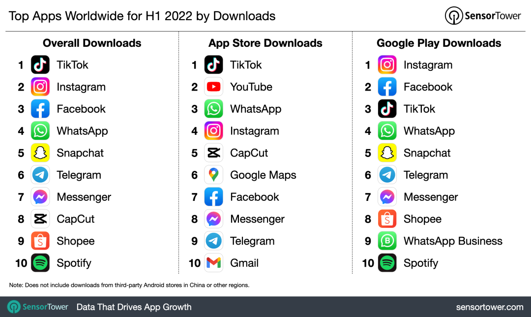 从下载量角度来看,2022 年上半年,排在第二到第五名的非游戏类应用依次是 Instagram、Facebook、WhatsApp 和 Snapchat。