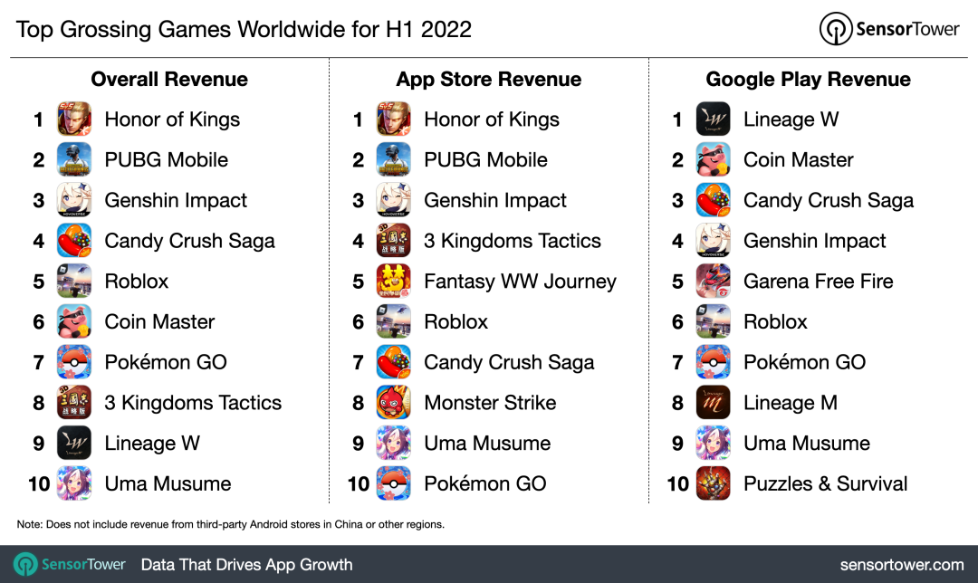 《糖果传奇》、Roblox 排名第四和第五,今年上半年的营收分别为 5.935 亿和 5.765 亿美元。